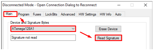 Signature does not match current device - связь установлена, но модель процессора выбрана неправильно. Попробуйте прочитать подпись AtXmega128 и Atmega 128.