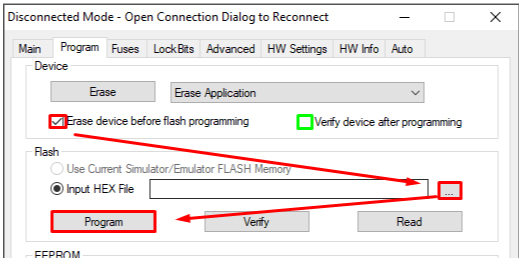 Поставьте обязательно галочку “Erase device before programming”