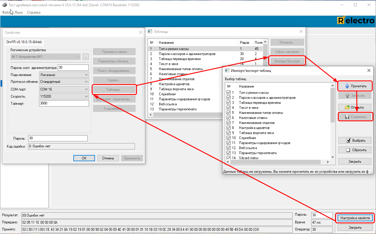 Чтобы сохранить настройки в файл, в Тесте Драйвера: Настройка свойств - Таблицы - Импорт/Экспорт - Прочитать - Сохранить - выбрать путь - Сохранить