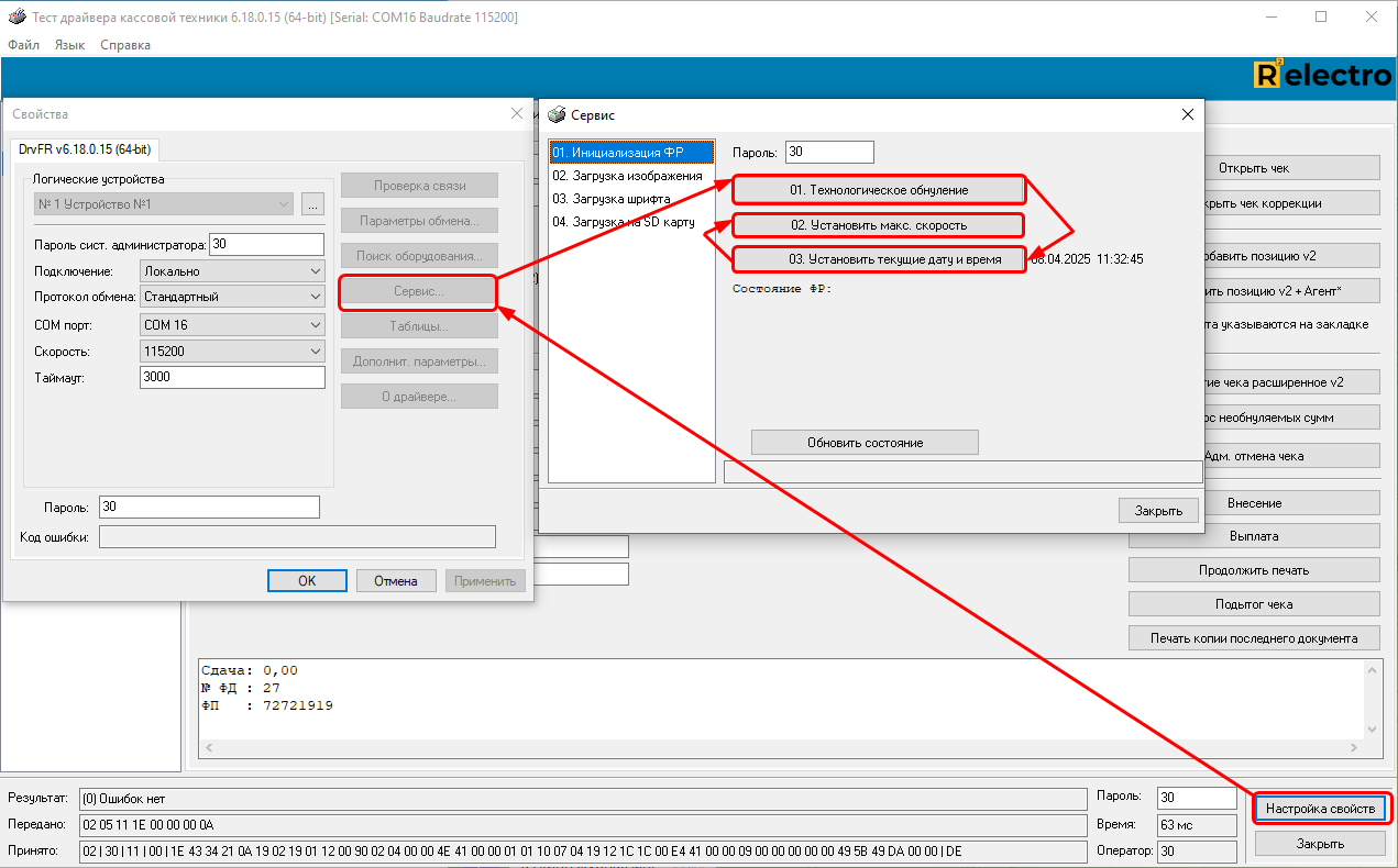 Настройка свойств - Сервис - 01.Технологическое обнуление - 03.Установить текущее время и дату - 02.Установить максимальную скорость