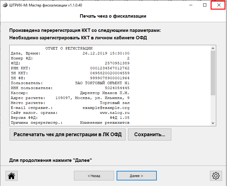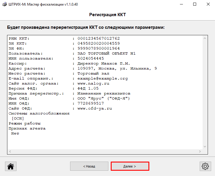 На этапе проверки всех реквизитов после нажатия на кнопку "Далее" сформируется отчет о перерегистрации: