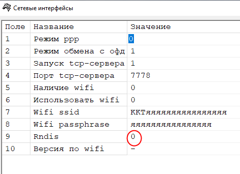 - Если включён RNDIS, то необходимо отключить. Для этого в Таблице 21 Поле 9 установить значение "0", перезагрузить ККТ и подключиться к ней по VCom.