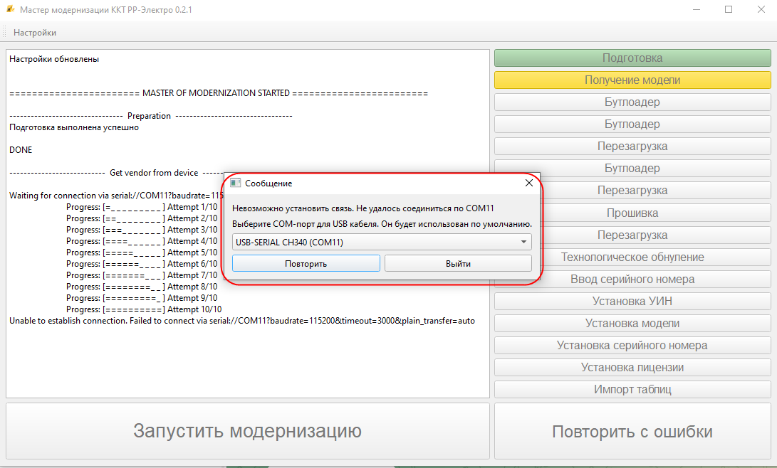 Если в настройках указан неверный порт, то в процессе модернизации возникнет запрос на выбор корректного порта: