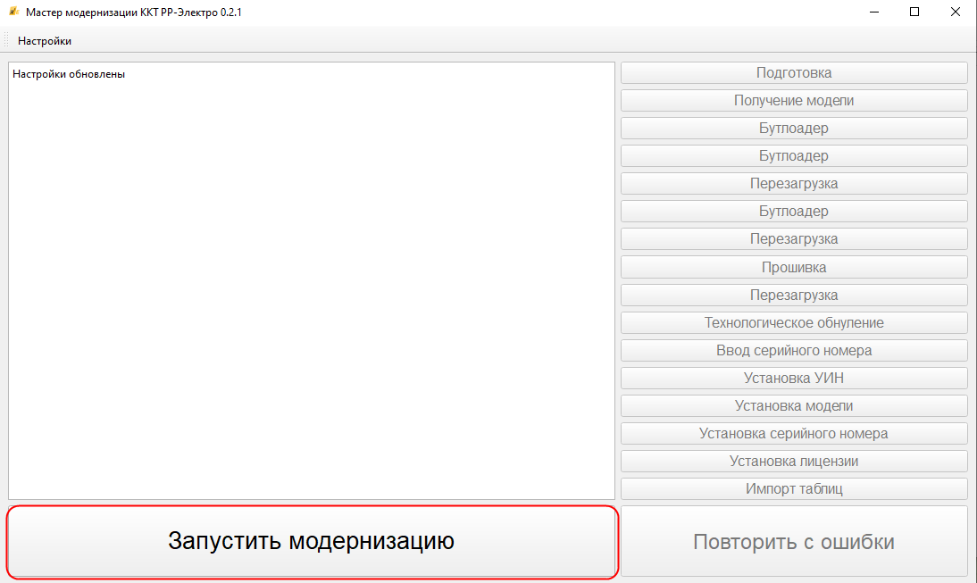 1 - Окно вывода логов 2 - Раздел "Настройки" 3 - Этапы модернизации, которые при прохождении процесса подсвечиваются: