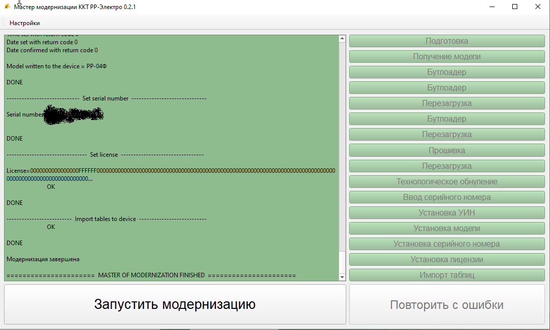 Дожидаемся окончания процесса модернизации. Важно!!! нельзя отключать питание ККТ или компьютера. Дождитесь окончания процесса!!!